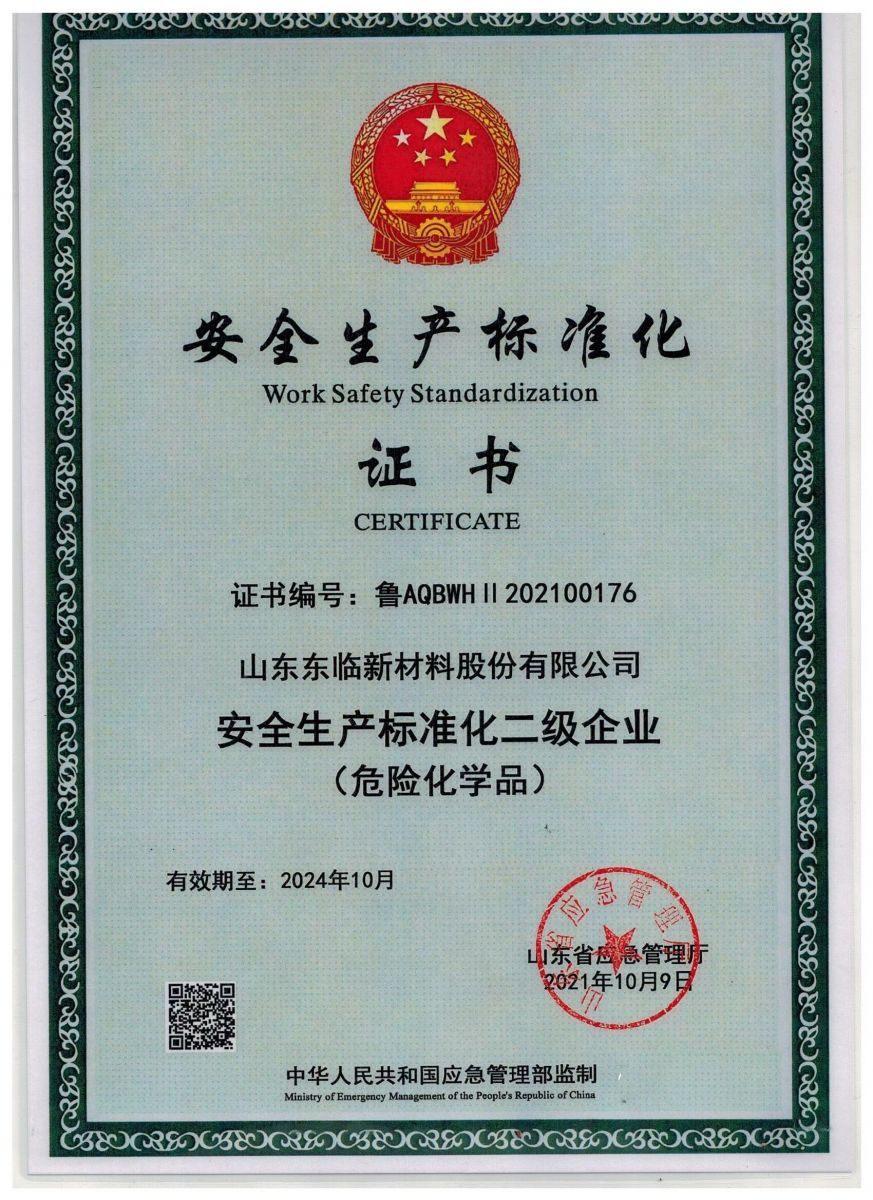 近日,山東東臨新材料股份有限公司獲得了由國家應急管理部監制、山東省應急管理廳頒發(fā)的“安全生產(chǎn)標準化二級企業(yè)”證書(shū)。